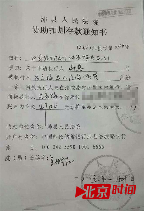 银行出具的《协助扣划存款通知书》 图/北京时间