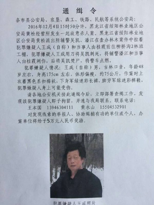 12月5日,黑龙江省绥阳林业地区公安局消息,刺死辅警并焚尸的通缉嫌疑人王成被抓获。今日,“北京时间”(微信号btime007)获得最新消息,该局工作人员称,王成在昨日被抓捕过程中割腕自杀,在送往医院的途中抢救无效死亡。