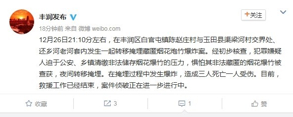 12月26日21:10分左右,在丰润区白官屯镇陈赵庄村与玉田县渠梁河村交界处、还乡河老河套内发生一起转移掩埋藏匿烟花炮竹爆炸案。经初步核查,犯罪嫌疑人迫于公安、乡镇清缴非法储存烟花爆竹的压力,惧怕其非法藏匿的烟花爆竹被查获,夜间转移掩埋。在掩埋过程中发生爆炸,造成三人死亡一人受伤。目前,救援工作已经结束,案件侦破正在进一步进行中。