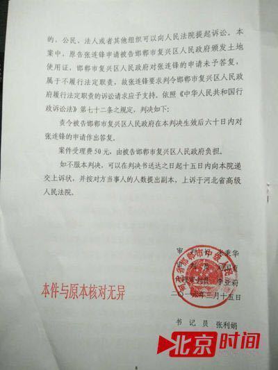 “北京时间”了解到,邯郸市中院在2016年3月作出判决,要求复兴区政府对张连锋提出颁发土地使用证的申请作出答复。今年6月,复兴区政府作出答复:争议地块与张连峰无关,土地补偿款系张连峰自愿垫付。