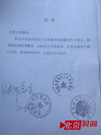 张连锋向“北京时间”出具的相关材料显示,2002年12月,邯郸市规划局向该市成品油市场管理办公室出具的“关于北环西加油站用地的情况说明”,证明张连锋的加油站是被无偿拆除。