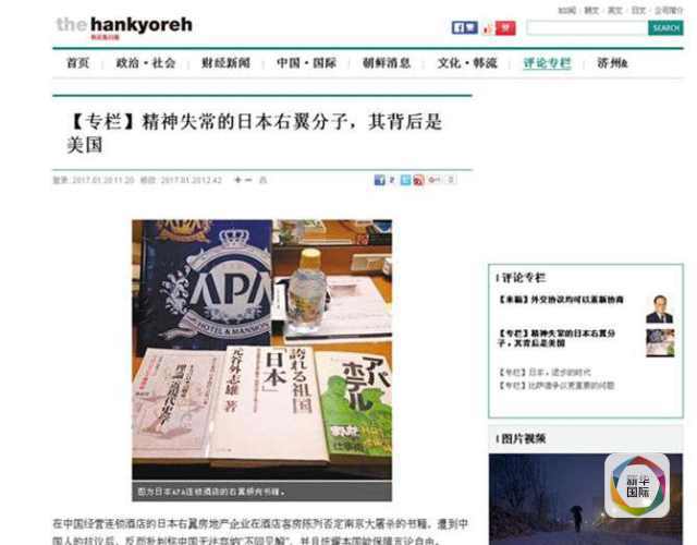 《韩民族日报》在评论中直接批评APA集团老板等日本右翼人士"精神失常"。评论说,APA酒店方面以所谓"言论自由"为借口拒绝撤走右翼书籍,把否认、遮掩侵华过程中残忍屠杀等军国主义罪行的行为妄称是"立场差异",甚至还胆敢将"基于事实的真正历史"挂在嘴边,"他们还正常吗"?