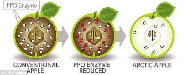普通苹果的细胞在受损破裂之后,内部的多酚氧化酶就会开始发挥作用,引起被称为"酶促氧化褐变"的化学反应,使苹果果肉迅速变成褐色。然而,"北极苹果"却不含多酚氧化酶,因为负责制造这种酶的基因被"静默"了。