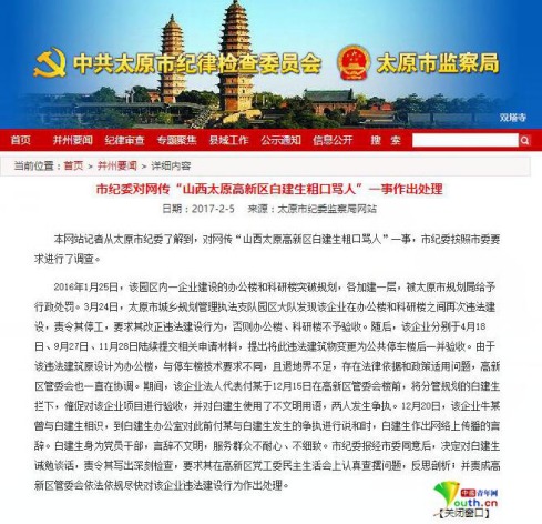 2月5日太原市纪委官方网站发布《市纪委对网传"山西太原高新区白建生粗口骂人"一事作出处理》。