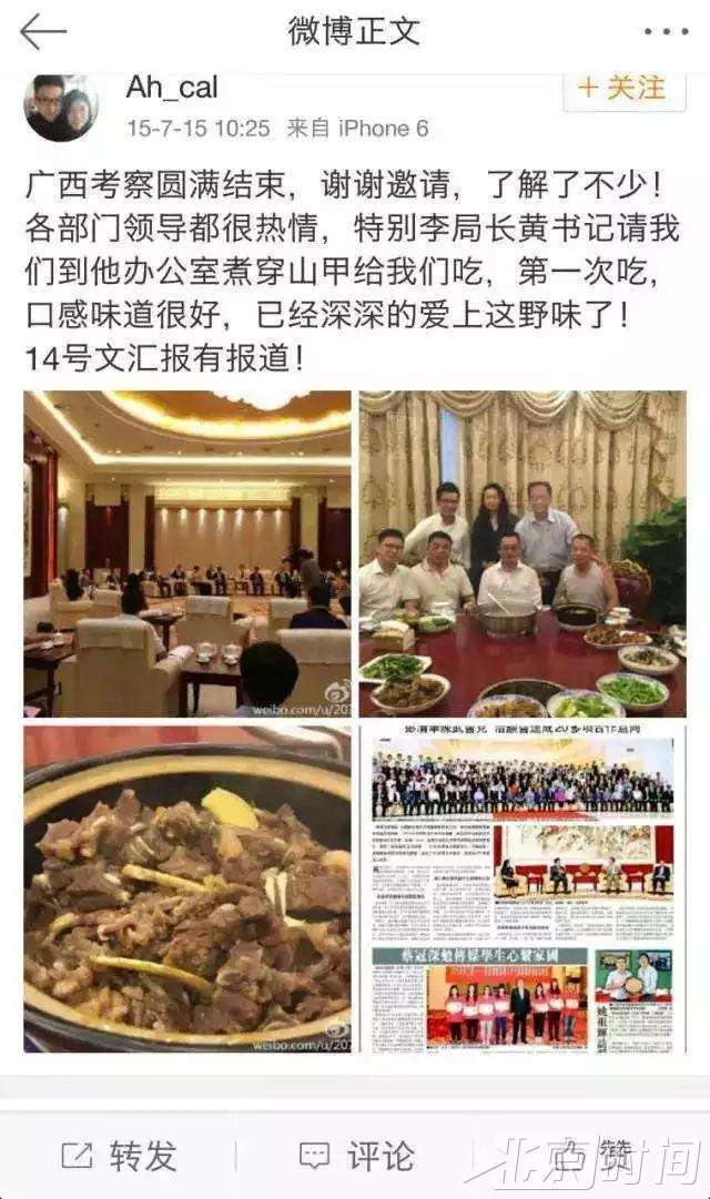 一名为Ah_cal的网友晒图称“(广西)李局长黄书记请我们在办公室煮穿山甲吃,第一次吃,口感味道很好,已经深深爱上这野味了”。该男子被网友戏称为“穿山甲公子”。