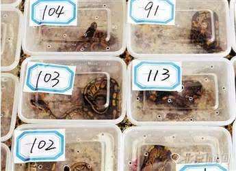 ↑网络卖家会将小蟒蛇放到一个有小孔的塑料盒里,通过物流将货品快递到全国各地。