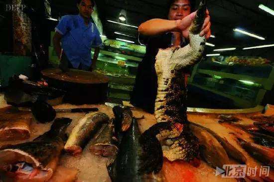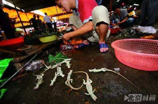 ↑菜市场上,一位摊主正在解剖清洗蜡皮蜥蜴。