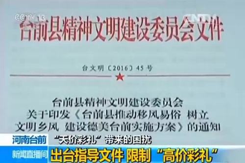 2016年年底,河南省台前县下发《台前县农村红白事标准参照指导意见(征求意见稿)》等文件,对农村彩礼提出了参照标准,要求彩礼总数控制在6万元以内。
