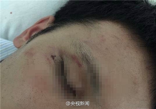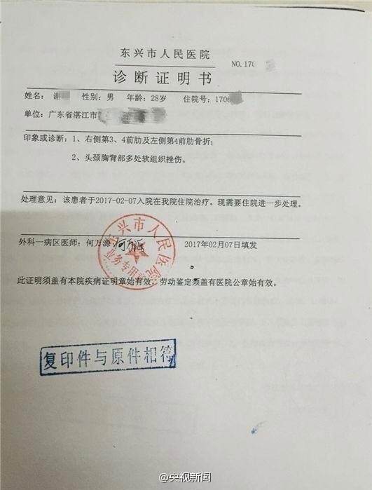 谢某受伤后的照片显示,其眼部、脖子处、手部等多处有明显的伤痕,另根据东兴市人民医院的一份诊断证明书,其右侧第3、4前肋及左侧第4前肋骨折,头颈胸背部多处软组织挫伤,需要住院进一步处理。
