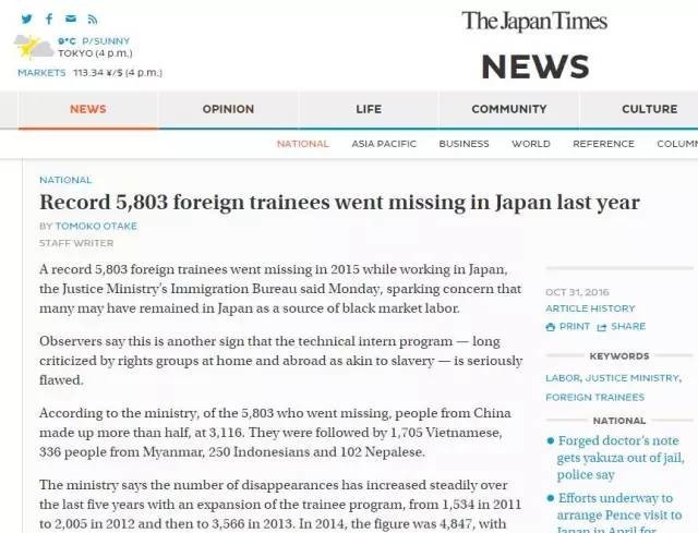 《日本时报》2016年的一篇报道称,2015年,共有5803名在日研修生失踪,其中来自中国的为3116人,占到一大半。过去5年,这个数字一直在不断增加。