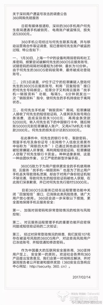 对此,何先生使用的360手机官方发布了声明。声明称,何先生的360云账号密码较简单,因此被破解登陆。何先生的银行卡号、取款密码、预留手机号及身份证号是在此前通过其他途径泄露的,故而银行卡资金会被转移。