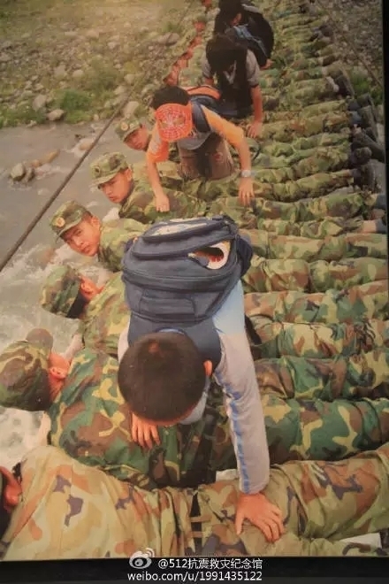 2008年6月13日,部队官兵在四川省地震灾区彭州市新兴镇抢修被地震损毁的寿荣索桥。由于铺设桥面的木板已经用完,尚未铺上木板的铁索因为涂满黄油相当湿滑而难以通行。解放军战士在风雨飘摇的索桥上用身板做桥板,为被河水挡住去路的孩子们搭起了“人桥”!在战士们铺就的“人肉桥”上,放学回家的孩子们顺利地通过了寿荣索桥。一位前来接孩子的家长流着泪说:"你比孩子的父母还要亲啊!"