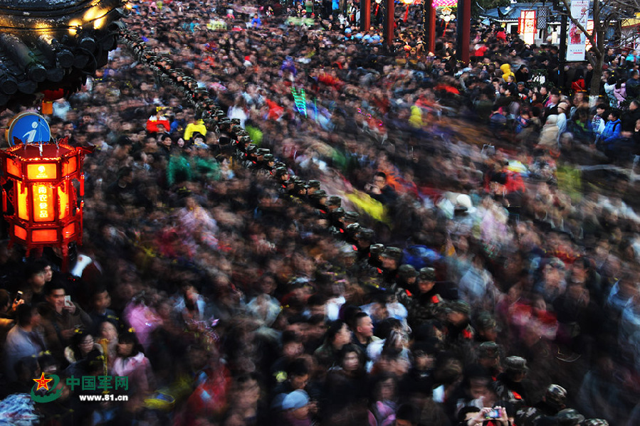 这张照片拍摄于2月11日江苏南京夫子庙秦淮灯会迎来日客流最高峰之时。面对巨大的客流压力,武警江苏总队第一支队出动近千名官兵,同公安、消防力量一起现场排成人墙,疏导客流,维护秩序。