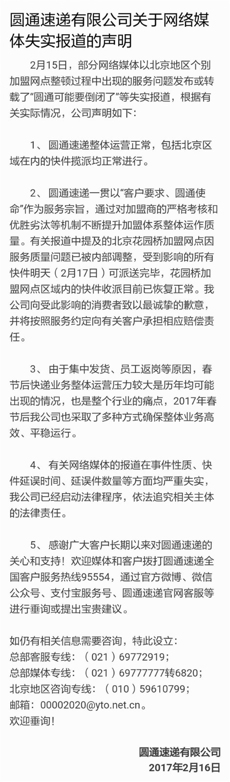 2月16日晚,圆通速递在其官方微博发布关于网络媒体失实报道的声明,称部分网络媒体以北京地区个别加盟网点整顿过程中出现的服务问题发布或转载的“圆通可能要倒闭了”等为失实报道。