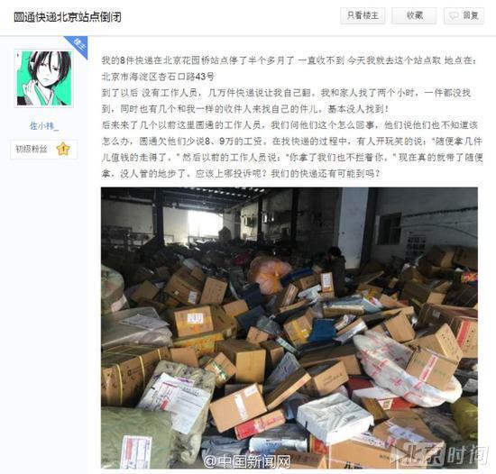 本月11日,贴吧"圆通快递吧"传出一篇题为《圆通快递北京站点倒闭》的帖子,发帖人"佐小祎"称有8件快递在北京花园桥站点停了半个多月,一直没有收到,之后他去了该站点,发现几万件堆压快递,圆通工作人员则对他表示,圆通欠他们少说8、9万的工资。