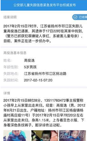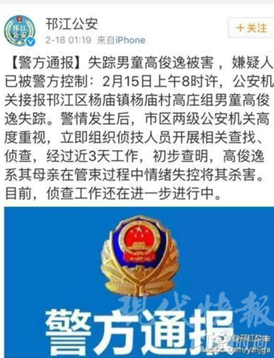 2月18日凌晨1点18分,扬州市邗江公安分局发布警情通报:失踪男童高俊逸被害,嫌疑人已被警方控制。初步查明,高俊逸系其母亲在管束过程中情绪失控将其杀害。