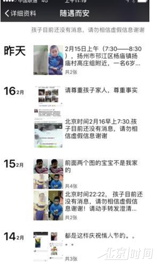 现代快报记者同时注意到,家人在发布寻人消息时,提供了李红的手机号码。而该手机号码对应的微信号 " 随遇而安 ",在事发当天晚上 10 点 26 分发布微信," 孩子目前还没有消息,请勿相信任何虚假信息,谢谢!请动手转发澄清!" 此后该微信号又发布两张疑似照片,并辟谣说," 前面两张图的宝宝不是我家的。"