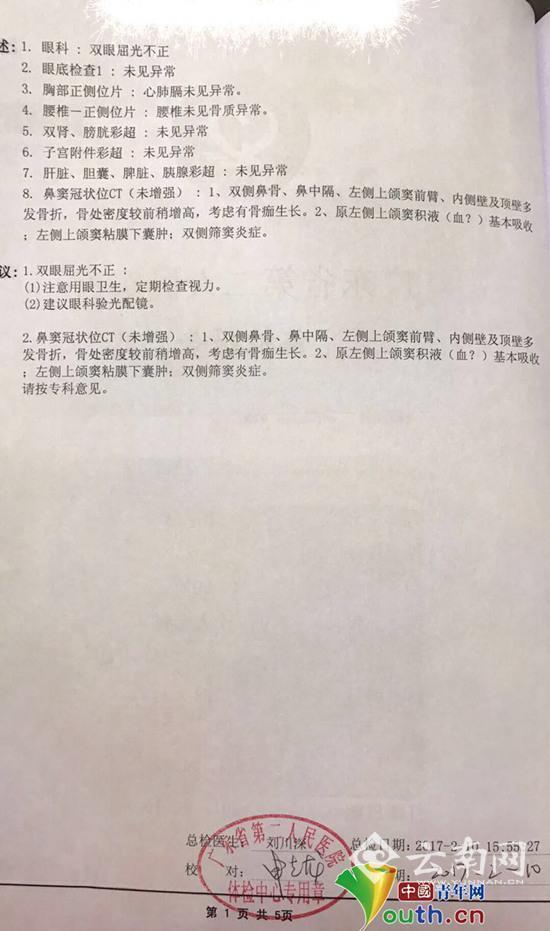 由于身体不适,她此前曾经前往医院自行检查,在该女子出示的一份广东省第二人民医院体检报告中显示,"双侧鼻骨、鼻中隔、左侧上颌窦前臂、内侧壁及顶壁多发骨折、骨处密度较前稍增高,考虑有骨痂生长;原左侧上颌窦积液基本吸收;左侧上颌窦粘膜下囊肿;双侧筛窦炎症。"