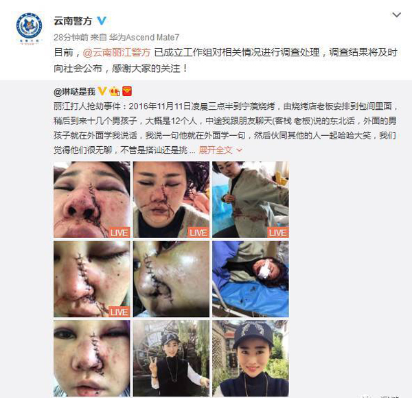 1月24日晚,微博用户@琳哒是我爆料:2016年11月11日凌晨,她在丽江遭多名男子辱骂暴打,被用碎酒瓶划脸且被录视频,男子离开时抢走女子钱包等财物。女子随后在丽江住院,期间有名为和元松的人去投案,但并未给受害者道歉或者去医院探望。女子称接到自称民警的电话,但“民警”对抢劫的事“闭口不提”,并要求删微博。