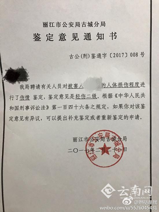 丽江市公安局古城分局出具的伤情鉴定中显示,"如果对该鉴定意见有异议,可以提出补充鉴定或者重新鉴定的申请。"对于该规定,她表示这个问题目前还在考虑。
