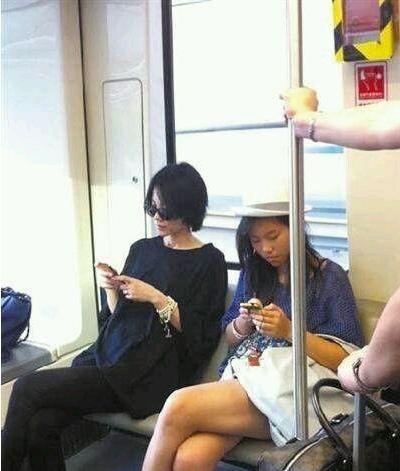 王菲和大女儿窦靖童,王菲气场好强大,两个人都自顾自的玩手机,该不会是在相互传简讯吧。