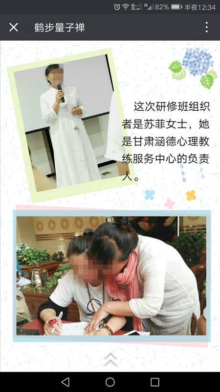 需要提及的是,醒来老师曾经转发过一期鹤步量子禅宣传资料,介绍一位名叫"苏菲"的女士为甘肃涵德心理教练服务中心的负责人。