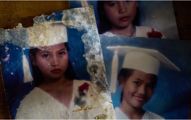 安赫莱斯市被称作“性交易超市”,到处都能见到外国人以及在酒吧里赚钱的菲律宾女子。城市的街道上到处都是霓虹灯、高跟鞋、贴身内衣和嘈杂的音乐。这三个姐妹都不是自愿来到这里的。她们都曾经是高中里的好学生,被自己的母亲形容成“圣洁的孩子”。图为三姐妹的家中抢救出来的高中毕业照,左边是乔乔,右侧下方是杰玛,右侧上方是乔安。
