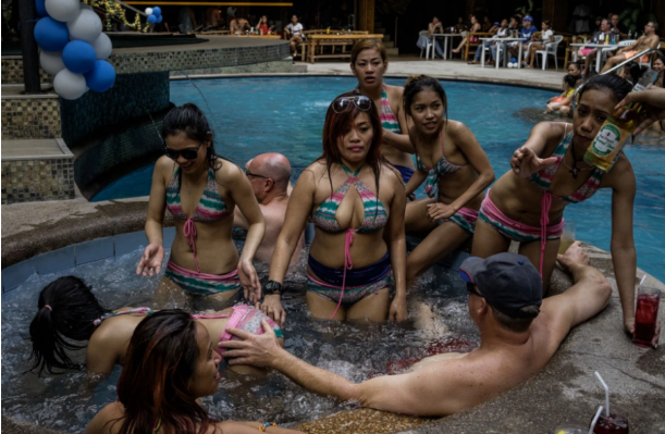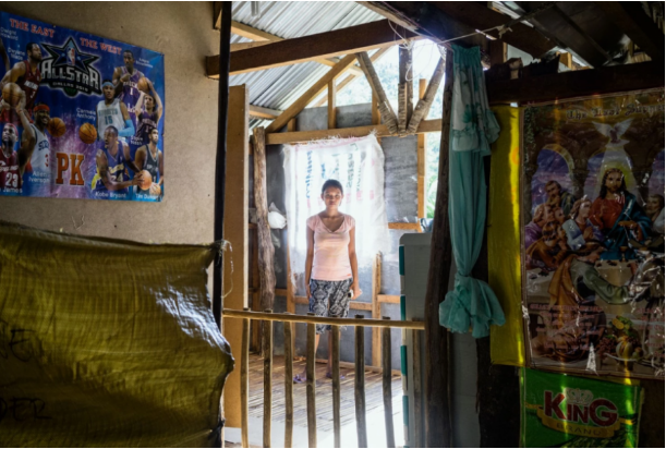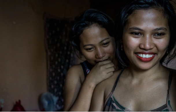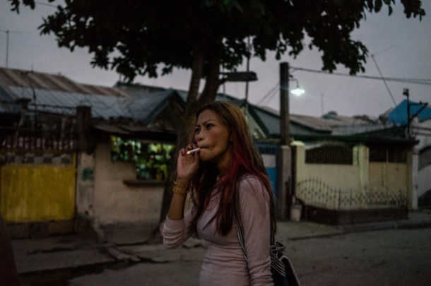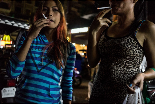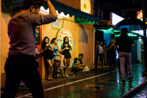 乔乔和杰玛是众多因台风而流离失所、不得不从事性交易的菲律宾女性的代表。台风“海燕”于2013年袭击菲律宾,使大约400万人流离失所。它是有记载以来威力最强的热带气旋。在台风“海燕”结束一个月后,联合国人口基金估计,约有5000名女性遭受到性暴力。美国国务院负责打击菲律宾人口贩运部门的负责人达琳·帕哈里托将台风“海燕”肆虐过后的场景描述为“人贩子的盛宴”。图为安赫莱斯市,一间酒吧外的女子。