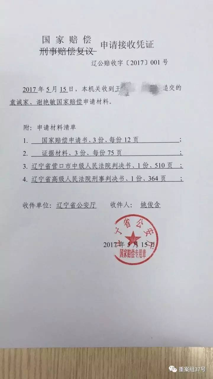 5月15日,辽宁省公安厅出具《国家赔偿申请接收凭证》,表示已经收到袁诚家夫妇的国家赔偿申请材料,其中包括12页的赔偿申请书,75页的证据材料,以及共计874页的一二审判决,该凭证落款加盖了"辽宁省公安厅国家赔偿专用章"。
