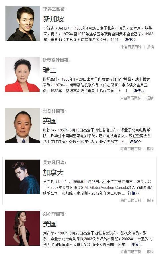 这其中,最有争议性的就是“功夫皇帝”李连杰,作为国人引以为豪的国际巨星,李连杰却带着一家人加入了新加坡籍,李连杰称他做这一切只是为了女儿能够接受到更好的教育,但即使如此,他依然能够在国内拿到高达一亿的电影片酬;而“国宝级”女演员斯琴高娃早已加入瑞士籍,严格意义上来讲,她已经不再是我们的“国宝”了;至于张铁林,很多人都无法想象一直在荧幕上扮演“皇帝”的其实是个英国人......
