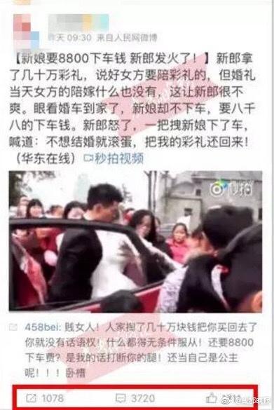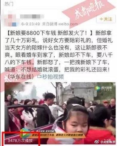 "婚礼是一件喜庆的事情,通常婚礼上新郎都不敢开罪新娘。但今日这场婚礼却显得有些分外,婚车到达要下车的一会儿,新郎发火了,对新娘拳打脚踢……"成都晚报记者打开这一段时长为1分18秒的视频看到,视频画面并未标明时间、地点、人物等具体信息,模糊的画面仅配有一段女声旁白,旁白内容异常火爆,包含"新郎对新娘拳打脚踢"、"几十万彩礼被丈母娘藏起来给新娘弟弟用"、"新娘索要8800元下车费"、"不愿意成婚滚蛋,把我的彩礼还回来"等充满矛盾、戏剧化的元素。该视频经全国各大媒体转发报道后,迅速引起网友热议,大多网友站在了新郎的一方,指责新娘及其家人:"娘家人也是够恶心了,这是卖女儿吗?"