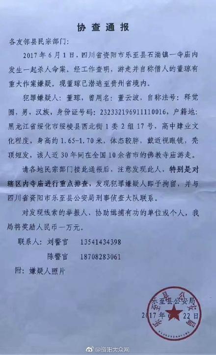 6月22日,四川省资阳市乐至县公安局向各友邻县民宗部门发协查通报称,6月1日,该县石湍镇一寺庙内发生一起杀人案,警方查明,游走并自称僧人的董琼有重大作案嫌疑,董琼已潜逃至贵州省境内。