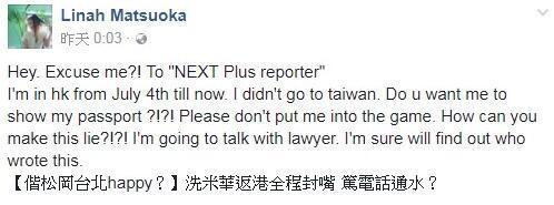 7月16日消息,据台湾媒体报道,澳门娱乐大亨周绰华(洗米华)14日被周刊爆料和日本辣模松冈李那共游台北,两人还被目击现身某宾馆,不过女方15日凌晨PO英文怒斥谣言:“要不要我亮出护照?拜托不要把我卷入这个游戏。”她6月底早已透过律师发声明澄清,没想到还是传言再起,此外,老婆陈慧玲(洗米嫂)正巧也带着2个女儿从台湾飞回香港。