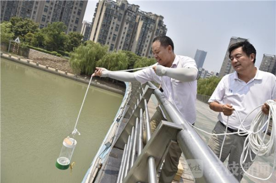中午11点多,吴琪的工作还没结束,另一组监测人员也出发了,他们要去对外秦淮河进行常规监测,省环境监测中心检测部主管武超和同事每人端着50多斤重的箱子往河边走去,里面装了量筒、水下温度监测仪、PH试剂等必备设备。选好了监测点,他们把量筒从河中心位置放下打水取样,拉上来之后再完成分装、测试等8、9个工序,为了保证数据的准确性,他们在同一条河流上又选了2个监测点,上述行为再重复2遍,他们顶着烈日花了1个多小时才完成,记者蹲在一旁采访,手里握着的采访设备几分钟就滚滚发烫,只能两只手轮流着来拿。他们完全没有注意到身边的变化,全神贯注得盯着监测仪上跳动的数字,认真的记录,不顾已经湿透的后背。常年的户外工作,武超已经晒成了古铜色,他也不介意,还开起了自己的玩笑:"我膀子上的这冰袖是老婆买的,觉得已经对不起这张脸了,要对的起膀子吧,这监测工作我干了20年了,20年前可是小白脸呀,现在没办法恢复过来了,可能伤得很厉害,以后演包公可能很合适吧,哈哈。"
