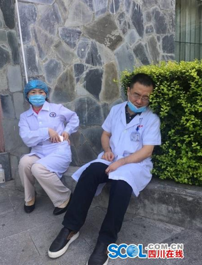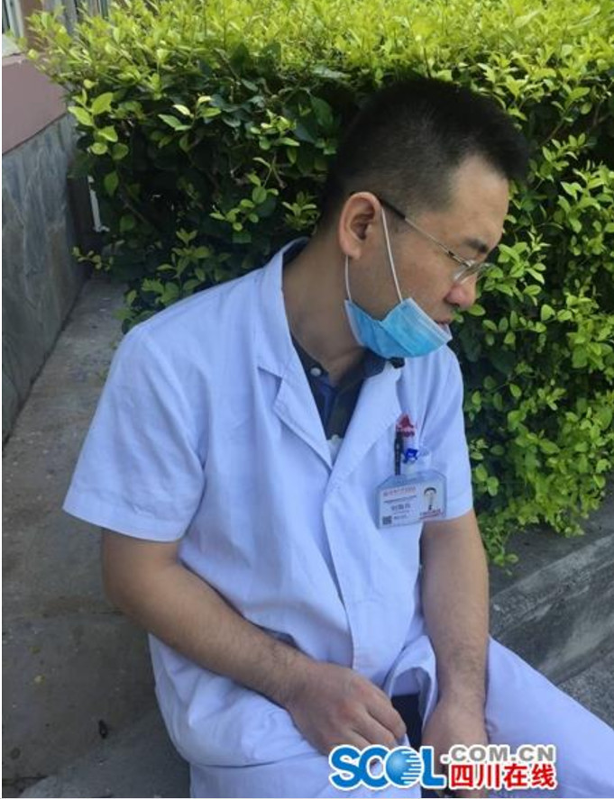 地震发生时,刘海兵和同事是最早抵达灾区的一批医护人员,他们将第一批重伤员接回医院后,立即开始紧张的手术,一台接着一台,一刻没有停歇。上午9点过,一夜没睡的刘海兵终于有了点空闲,靠坐在花坛边,休息片刻。