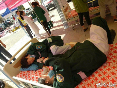 九寨沟县第二人民医院,忙碌一宿的医护人员,席地而睡,短暂休息,很快又将投入新一轮的救援。