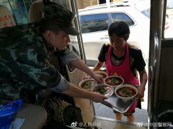 【救援途中 饭店老板端来热腾腾的牛肉面】9日早7时30分左右,乐山消防赴九寨沟地震救援官兵途经绵阳市平武县城。由于前方车辆拥堵,官兵只得原地待命,等待疏通。饭店的一位娘娘端来几碗热腾腾的牛肉刀削面,不管官兵如何推辞,就是要让战士们吃下:“你们远道而来,辛苦了”。
