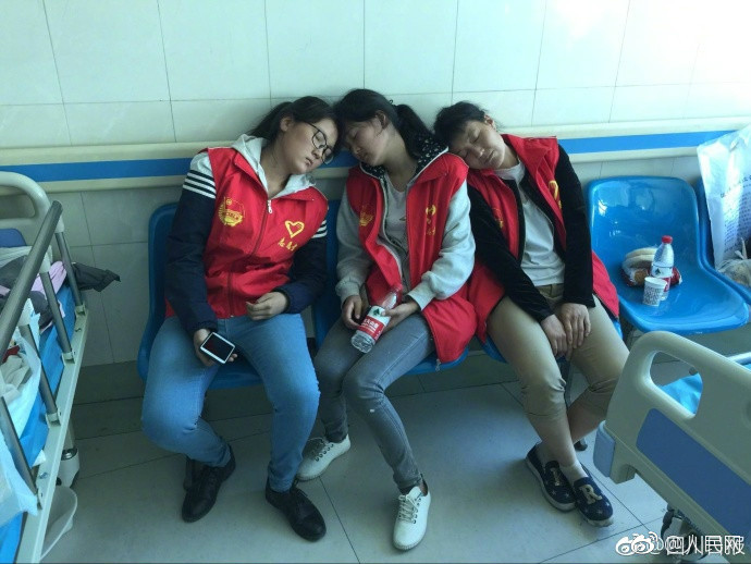 【灾区母女医院当志愿者彻夜未眠 三人靠着睡着】九寨沟县人民医院,三名志愿者靠在一起睡着了,她们是母女三人,妈妈叫杨明珍,两个女儿分别是袁菁、袁榕。地震后,惊魂未定的她们来到医院当志愿者,帮病人取药、送水,帮助搭帐篷、铺床,陪伴伤员……母女三人彻夜未眠。