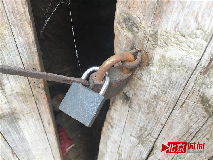 近日,“北京时间”(微信号:Btimedc)走访案发现场时,这个茅厕已经重新上了一把新锁,新旧两把锁共同锁住木门。茅厕外,杂草丛生,透过门缝能看到里面有一块水泥板靠在墙角,里面还堆放了几堆柴火。