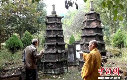 中新网郴州11月8日电(记者 徐志雄)“我们目前发现的古墓塔有36座,分布在寺庙周围的山林之中,其中有13座已经经过了专家鉴定。”11月8日,湖南郴州苏仙区龙岩古寺住持释礼春师傅向记者介绍,该寺发现的墓塔林中,还有一座极为罕见的双子七层墓塔。