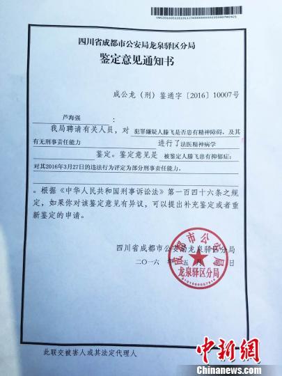 4月15日,成都警方通报称,涉嫌故意杀人罪的犯罪嫌疑人滕某已于案发次日被警方刑事拘留。5月4日,芦海强收到一份关于犯罪嫌疑人精神鉴定的《鉴定意见通知书》,其中显示,被鉴定人滕某患有抑郁症,对其2016年3月27日的违法行为评定为部分刑事责任能力。